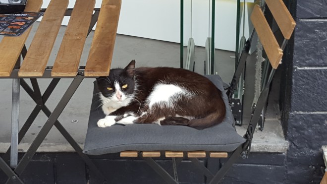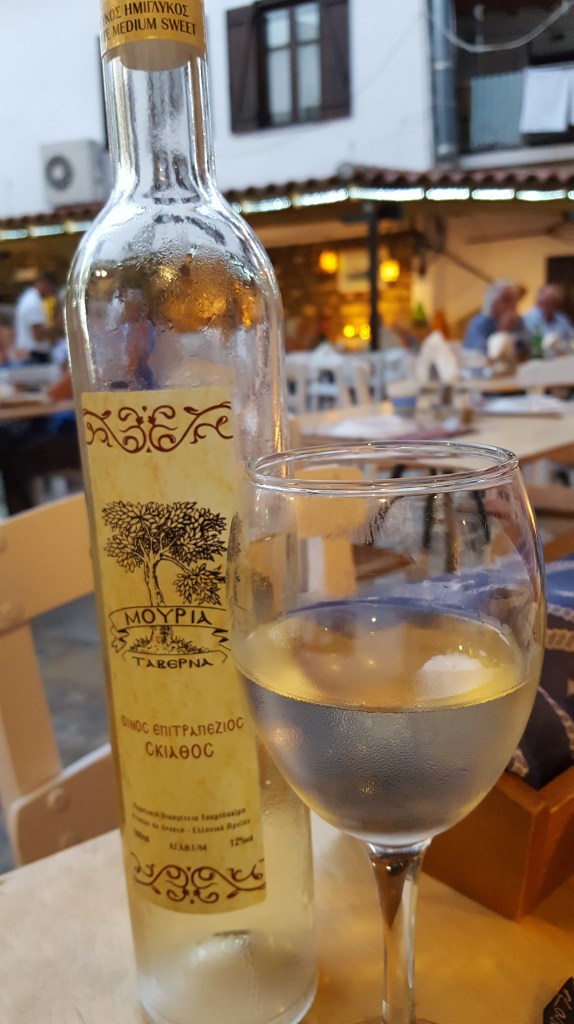 Taverne Mouria bevindt zich in één van de oudste huizen van Skiathos. De Griekse schrijver Alexandros Papadiamantis kwam hier vroeger vaak aan een tafeltje zitten om te schrijven terwijl hij zijn geliefde ‘mosxato’ wijn dronk. Dat vertelt de vriendelijke ober ons wanneer hij hun zelfgemaakte witte huiswijn komt uitschenken. Ik voel mij meteen op mijn plek. De schorpioenvis die we hebben besteld, komt op z’n geheel met kop en stekels. Hij vraagt of we willen dat hij hem fileert. ‘Het lukt wel.’ antwoord ik. Zo moet je ze eten. Vers gevangen die dag, gebakken op de grill en met niets anders geserveerd dan een schijfje citroen. De schorpioenvis heeft stevig wit vlees en smaakt heerlijk. Wanneer de ober de borden komt afruimen, blijven enkel de graten over. De katten kijken ons misnoegd aan en vertrekken teleurgesteld naar een andere tafel in de hoop daar een restje te bemachtigen. Ze springen niet op je schoot, ze miauwen of klauwen niet maar kijken je aan met een blik die het grootste medelijden opwekt. Naast ervaren filosofen zijn het ook schitterende acteurs.  ‘Ik zie dat jullie kenners zijn.’ zegt hij. ‘Sommigen laten een halve vis liggen omdat ze niet weten hoe hem te fileren.’ Ik glimlach omwille van het compliment.