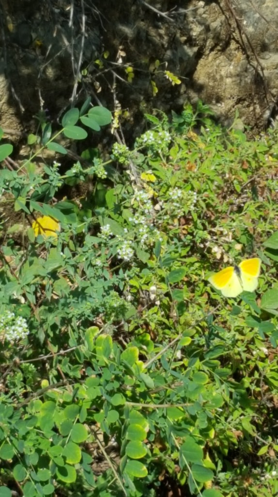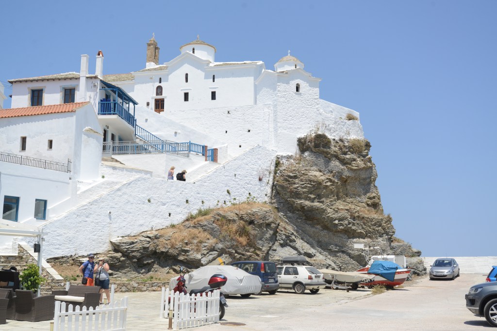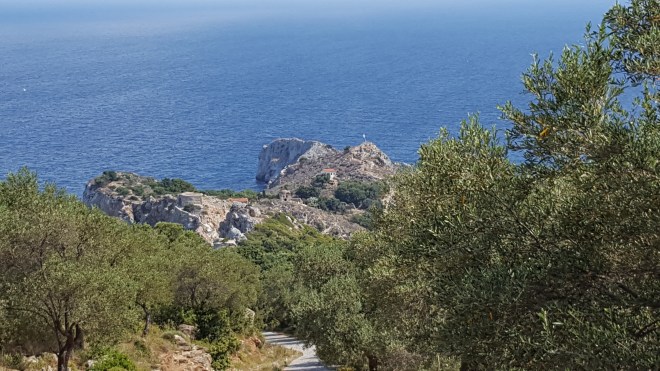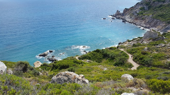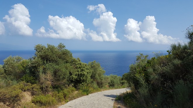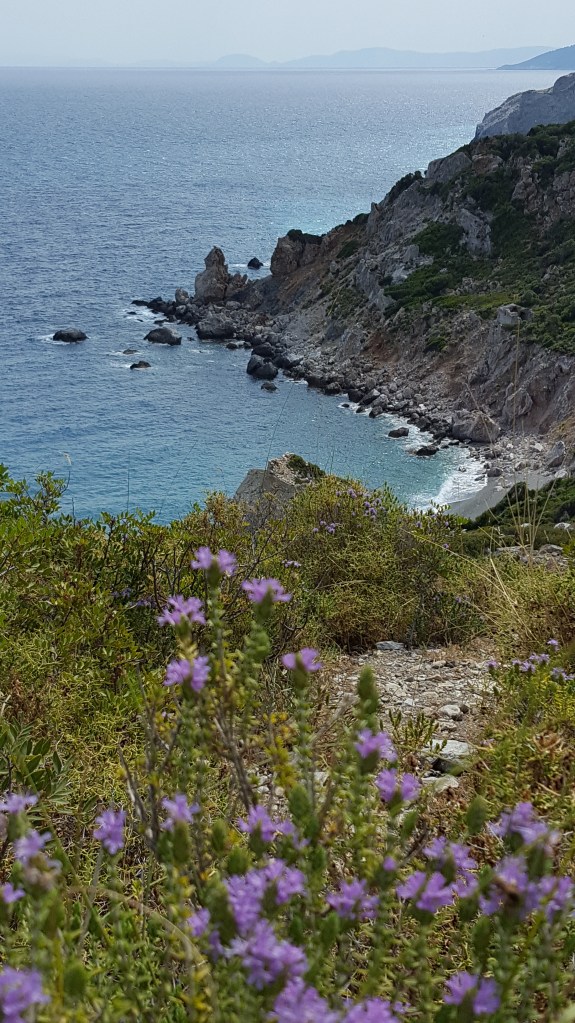 Devolgende dag rijden we richting ‘Kastro’, een restant van een Middeleeuws kasteel uit de 14e eeuw in het noordoosten van het eiland. Het is nog vroeg in de ochtend wanneer we aankomen. We zijn met de auto gereden tot waar de weg ophoudt. Van hier begint een aarden weg die door een pijnboombos loopt. Gelukkig staan er peilen want het Kastro is van hier niet te zien en je zou al snel denken dat je de verkeerde richting opgaat. Omdat we niet zeker zijn of we verder kunnen rijden, laten we de auto achter. Na een stuk door het bos gelopen te zijn, verandert het aarden weggetje in een geplaveid pad. Omdat het nog zo vroeg is, zijn we hier alleen. We lopen niet meer in de schaduw van de pijnbomen en de zon brandt al fel. Gelukkig hebben we water bij. Na zo’n twintig minuten afdalen, zien we in de verte de rots verschijnen met het Kastro. De hemel is blauw met slechts enkele witte wattenwolken die zo dichtbij lijken dat ik geneigd ben mijn hand uit te steken om ze aan te raken. Het geplaveide pad houdt opnieuw op. Om het Kastro te beklimmen moet je langs een aarden paadje met losse stenen. Langs de rand groeien prachtige distels met paarse bloemen en bij de struiken met gele bloemen zit het vol citroenvlindertjes. Behalve de wind is het stil. Achter de steile rotsen beneden verschijnt een strand dat er verlaten bij ligt.
