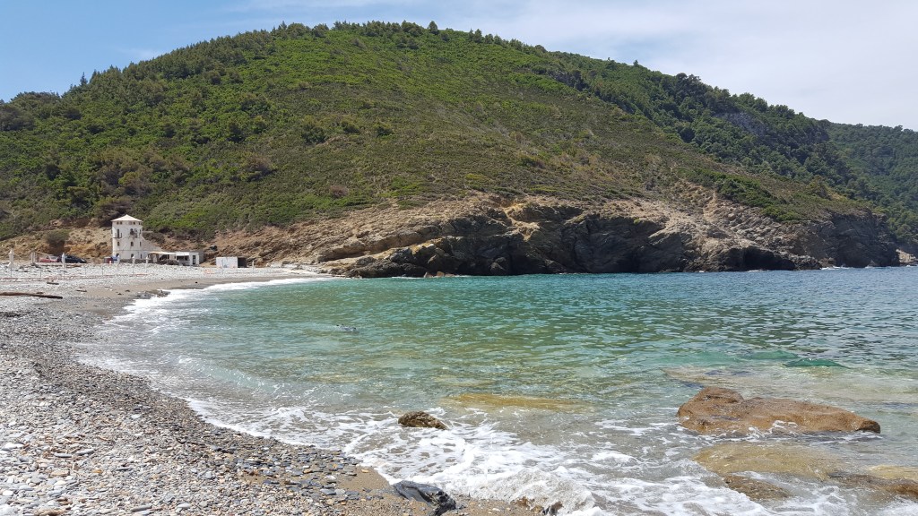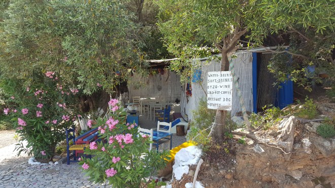 We vergeten de tijd. Het is onze maag die ons eraan herinnert dat het middaguur lang voorbij is en het wel tijd wordt om iets te eten. In Griekenland is het middaguur gelukkig heel rekbaar. Ook om vier uur kan je nog lunchen. Bij de toegang naar het strand zagen we een kleine taverne. We gaan de trappen omhoog en gaan zitten op het terras vanwaar je een prachtig uitzicht hebt over de hele baai. Een jong meisje bedient ons, ze is heel vriendelijk en zorgt voor een vlotte service. Het eten is lekker en helemaal niet duur, een echte aanrader. Na de lunch keren we nog eens terug naar het strand. De dag glijdt zalig weg al badend, slapend en mijmerend.