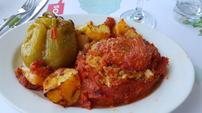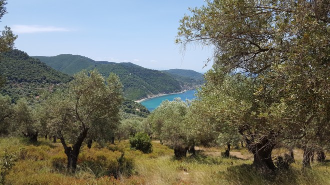 Ik heb gelezen dat de stranden aan de noordkust van Skiathos nog ongerept zijn en dus wil ik er heel graag één bezoeken. Alleen is het moeilijk er te geraken omdat er langs deze kant van het eiland weinig verharde wegen zijn. Tussen een veld met olijfbomen zien we dat er een weg naar beneden loopt en in de buurt ervan staat ook een pijl met ‘beach’ erop. Beneden schittert inderdaad een turkooisblauwe zee. In mijn enthousiasme overtuig ik mijn reisgenoot om het pad op te gaan. ‘Ben je zeker?’ vraagt hij meewarig. Het eerste stuk lukt vrij goed. We rijden met een slakkengangetje over het hobbelige pad naar beneden. Maar hoe verder we rijden hoe minder pad erover blijft tot er uiteindelijk alleen nog stenen en verdord gras overschieten. ‘Wat nu?’ Ik stap uit. ‘Ik ga kijken!’ Ik wil zo graag bij het strand geraken, maar het pad lijkt er verder niet beter op te worden. Dit kan onze kleine huurauto niet aan. Teleurgesteld stap ik weer in. Traag hobbelend over de keien keren we terug naar de verharde weg. Niet veel verder komen we een restaurant tegen en gezien het toch al middag is besluiten we te stoppen. We krijgen een tafeltje op het balkon vanwaar je een prachtig uitzicht hebt over de zee. Ik heb het wat frisjes en trek mijn pull aan. Even later komen ook de Engelsen die we eerder in het barretje zagen toe. Ik bestel ‘gemista’, gevulde groenten. Ze zijn perfect klaargemaakt. Onder ons zie ik een moestuin die vol staat met pepers en tomaten. Verser dan dit kan niet.