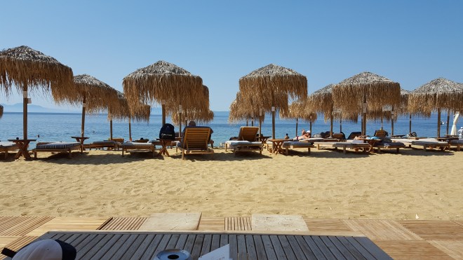De volgende ochtend stel ik voor om koffie te gaan drinken aan het strand tegenover ons verblijf. Het heeft net zo’n goudgeel zand als dat van Koukounaries, alleen komen de pijnbomen hier niet zo dichtbij het strand. Het is nog vroeg en er is weinig volk. Koffie drinken, de zon voelen en over de zee uit staren. Er is geen heerlijker manier om wakker te worden!