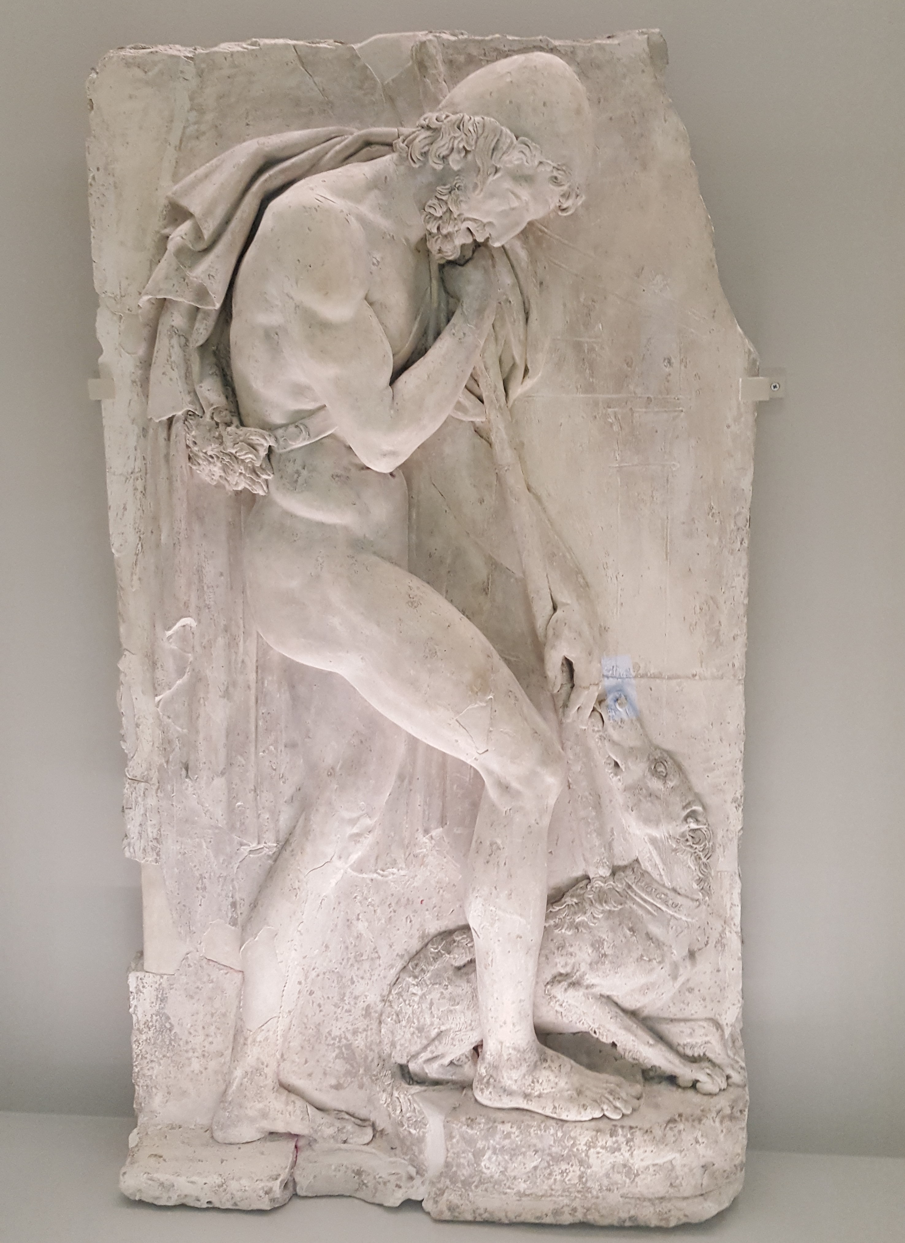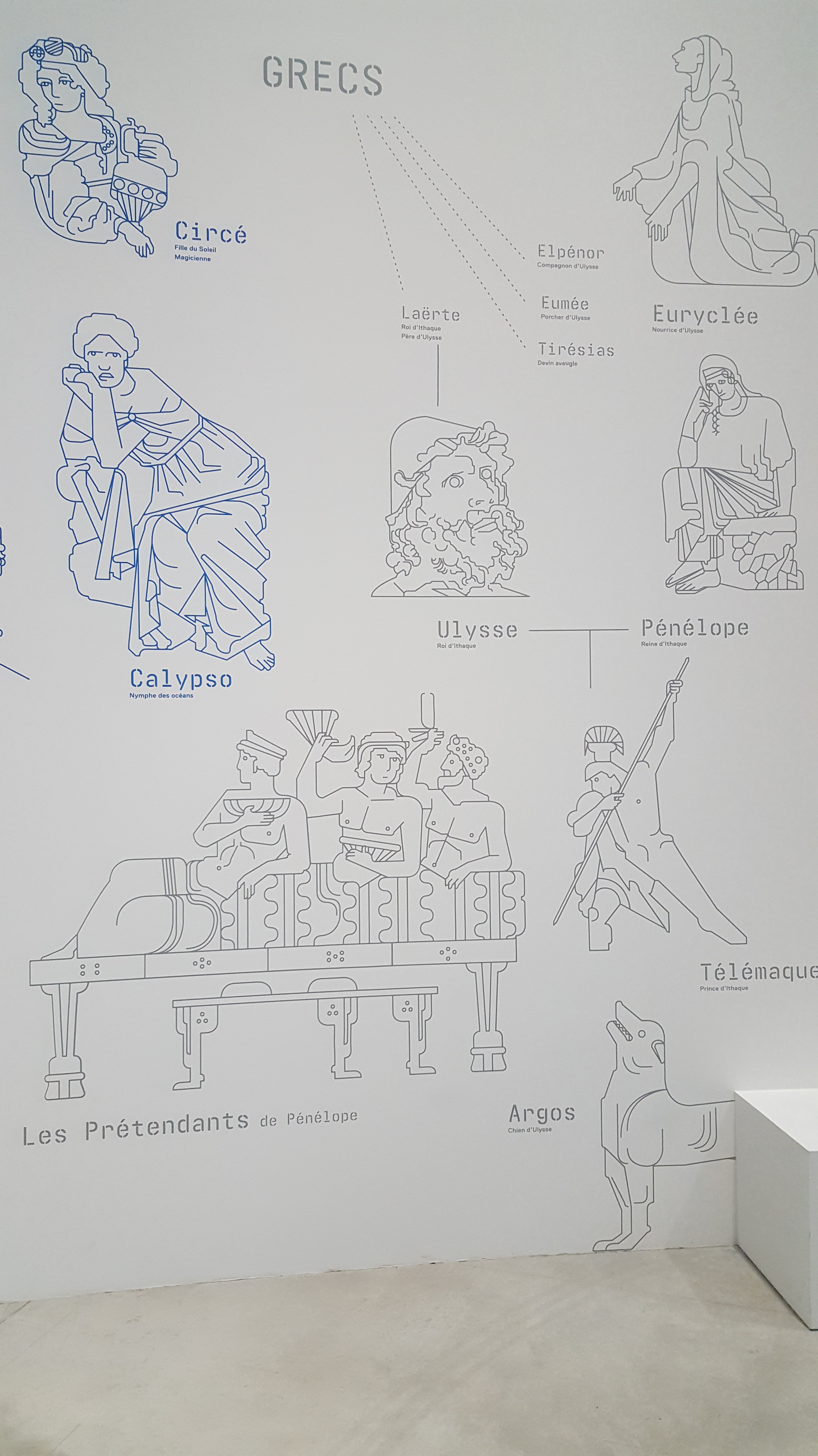 Verderop neemt de expositie ons mee in het verhaal van de Odyssee. Geen heldendicht over oorlog deze keer, maar het verhaal van de listige Odysseus, koning van Ithaka en bedenker van het houten paard van Troje die na de Trojaanse oorlog nog tien jaar gedwongen rondzwerft over de Middellandse Zee samen met zijn manschappen. De wereld van de Odyssee is er één vol mythische figuren en bizarre monsters zoals Scylla, het zeskoppige monster, de eenogige Cyclopen en de Sirenen die door hun gezang de voorbijvarende boten op de kliffen te pletter lieten slaan. Maar er zijn nog meer uitdagingen op deze woelige tocht in de vorm van enkele vrouwelijke figuren. Zo is er de tovenares Kirke en de godin Calypso die hem elk bewustzijn van tijd ontneemt waardoor hij denkt zeven dagen gevangen te zitten op het eiland Ogygia in plaats van zeven jaar. En dan is er ook nog eens de bevallige Nausikaä, dochter van koning Alkinoös, die hem ontmoet op het strand en uiteindelijk met hem wil trouwen. Ik herinner mij ook goed hoe ontroerend ik de passage vond die we eveneens vertaalden in de les Oudgrieks waarin Odysseus eindelijk aankomt op Ithaka en hij als eerste na twintig jaar herkend wordt door zijn trouwe hond Argos die vervolgens sterft nadat hij zijn meester terug heeft gezien. Zijn oude voedster Eurykleia herkent hem vervolgens aan zijn voeten wanneer ze die na zovele jaren terug wast. Alweer geeft Homeros blijk van zijn inzicht in de menselijke psychè en weet hij als geen ander de menselijke emoties weer te geven.
