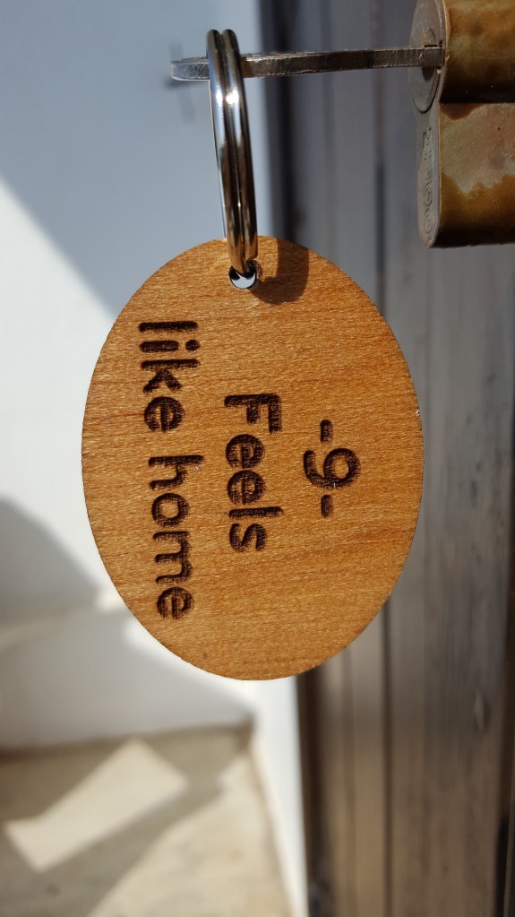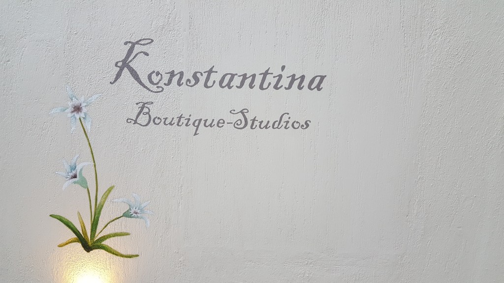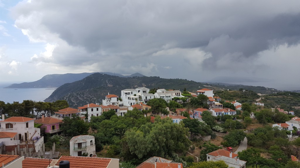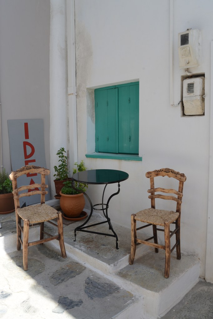 Aan de haven bij Patitiri is het gezellig druk en is er van het gevaar weinig te merken. We gaan een autoverhuurkantoor binnen om een auto op te halen. Even later zijn we al op weg. Het eiland is niet groot en na zo’n kleine tien minuten komen we al aan bij de oude stad waar we een kamer geboekt hebben bij Konstantina Boutique Studios. We rijden tot bij de oude stad, tot we merken dat we met de auto niet verder kunnen en we te voet naar de studio’s moeten. Dus laten we de auto achter op de dichtstbijzijnde parking en gaan eerst zonder koffers op verkenning. Een mens leert al doende. Ik herinner mij een keer op Kreta waar het sleuren met de valies door de nauwe steegjes, een grote schaafwonde langs de zijkant van mijn knie had opgeleverd. We klimmen langs kleine paadjes tussen de huizen en patio’s door. Er is één geur die overweldigt, hij is zoet en fruitig. Ik hoef niet lang na te denken wat het is, heel het dorp staat vol heerlijk geurende vijgenbomen. Ondertussen zijn we nog steeds op zoek naar onze verblijfplaats, zoals dat gaat in Griekenland zijn er weinig straatnaamborden of huisnummers. Je krijgt de naam van het dorp en daarmee moet je het doen. Dus spreken we een beetje vermoeid een toevallige passant aan. De mevrouw is Engelse en legt ons vriendelijk uit dat we de afslag moeten nemen bij de waterput. Ze lijkt een habitué, misschien woont ze hier wel. Pas later zullen we merken dat het dorpje wel meer Engelse inwoners heeft. In ieder geval ze heeft ons goed op weg geholpen, want om de hoek zie ik ineens de naam in sierlijke letters op een witgekalkte muur verschijnen. Konstantina, de gastvrouw, komt ons onmiddellijk tegemoet. ‘Welkom! Waar waren jullie? Ik probeerde jullie te bellen.’ We vertellen dat we even hebben moeten zoeken. ‘Oh wat jammer, ik had jullie nog gemaild dat ik jullie kon oppikken.’ Nu ja, dat zie je niet als je internet niet ingeschakeld is op je telefoon. ‘We hebben je gevonden, het is oké!’, stellen we haar gerust.