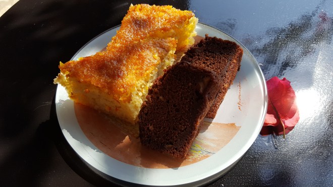 Ik heb iets met Griekse Nounou melk. Het is één van de eerste dingen die ik haal in de supermarkt. Wanneer ik dan wakker word en verlang naar koffie, maar niet hou van oploskoffie, open ik het brik frisse, zoete Nounou melk dat in de frigo op me wacht. Ik gooi de luiken open en installeer me op het balkon. Laat mijn ogen wennen aan het felle zonlicht. Hoe beter dat gaat, hoe meer zee ik met mijn blik kan vasthouden. Wanneer we beiden klaar zijn, wandelen we over het grasperk naar de buitenkeuken. Ontbijt onder een fuchsia bougainville. Er liggen enkele felroze blaadjes op het ronde, gietijzeren tafeltje gedwarreld. En we worden verwend. Er is geen menukaart, er is alweer Griekse gastvrijheid. Onze gastheer brengt ons het ene bordje na het andere dat Mando, zijn moeder, vers in de keuken voor ons bereidt. Huisgemaakte cake, een groot stuk met sinaasappel en honing en nog één met chocolade, verse eieren, yoghurt, fruit… we zitten eigenlijk al vol, maar dan is er nog ‘stroggilo’, een typisch Grieks hartig gebak. Het is een ronde sliert gefrituurd deeg gevuld met spinazie en kaas. ‘Alles komt hier uit onze eigen moestuin die mijn mama bewerkt,’ zegt hij ons fier. ‘De eitjes komen van onze kippen en we hebben ook geiten voor onze kaas. Willen jullie nog iets eten? Het is geen probleem, we maken het zo klaar!’ We bedanken vriendelijk en zeggen dat we nu echt wel vol zitten, maar dat het heerlijk was! Wanneer we op de laatste dag vragen wat onze schuld is, vraagt hij niets extra voor al die gerechten. ‘Jullie zijn onze eerste klanten dit jaar, maakt niet uit, we hadden toch genoeg.’