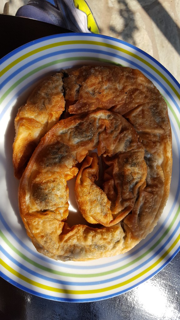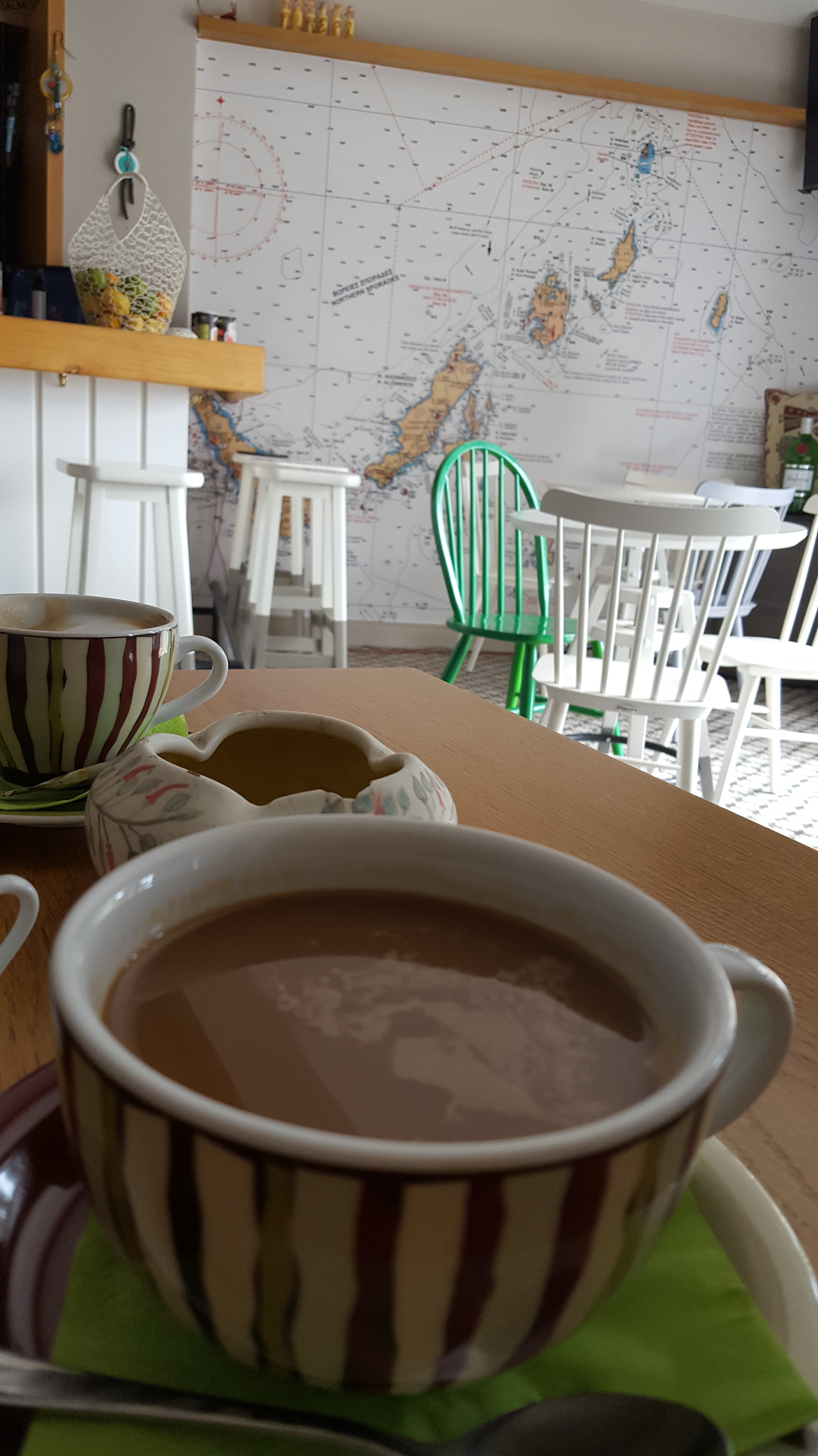 Na de lunch gaat het weer regenen. Er valt niet veel te beleven. Terug in de oude stad gaan we in het meest gezellige koffiehuis ‘Piperi’ zitten en slurpen de druilerige namiddag weg met een warme cappuccino. In de vooravond wandelen we naar het hoogste punt in het dorpje. We ontdekken nog meer leuke restaurantjes en winkeltjes. De tafels lijken allemaal gereserveerd. Jammer. Omdat het terug is gaan regenen en we geen zin hebben in een grote maaltijd, gaan we zitten op het met plastic zeil overdekte terras van de pita-bar. Enkele mannen komen toe om naar een voetbalmatch te kijken. Het grote tv-scherm wordt naar binnen verhuisd aangezien het zeil wat lekt. De Griekse pita en het bier smaken. Zo tussen de Grieken die voetbal kijken, een biertje drinken en roken, lijkt het wel of we hier ook wonen. Wanneer je toegelaten wordt tot de alledaagsheid, tot hun leefwereld, is het alsof je ophoudt met reizen en je een beetje local wordt.