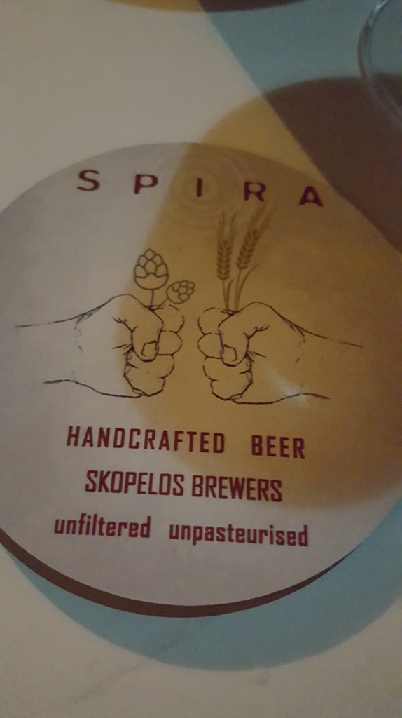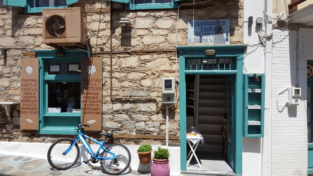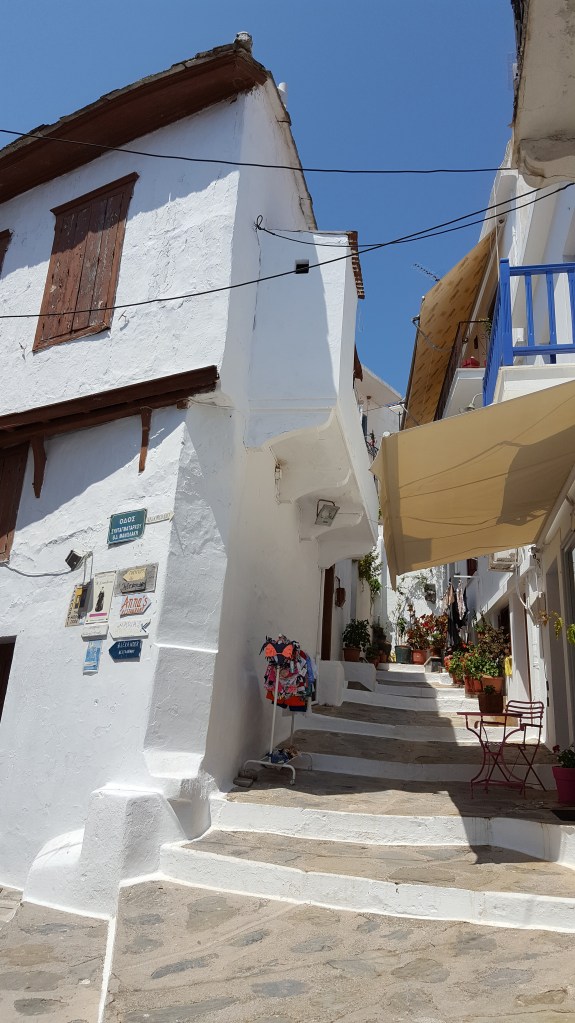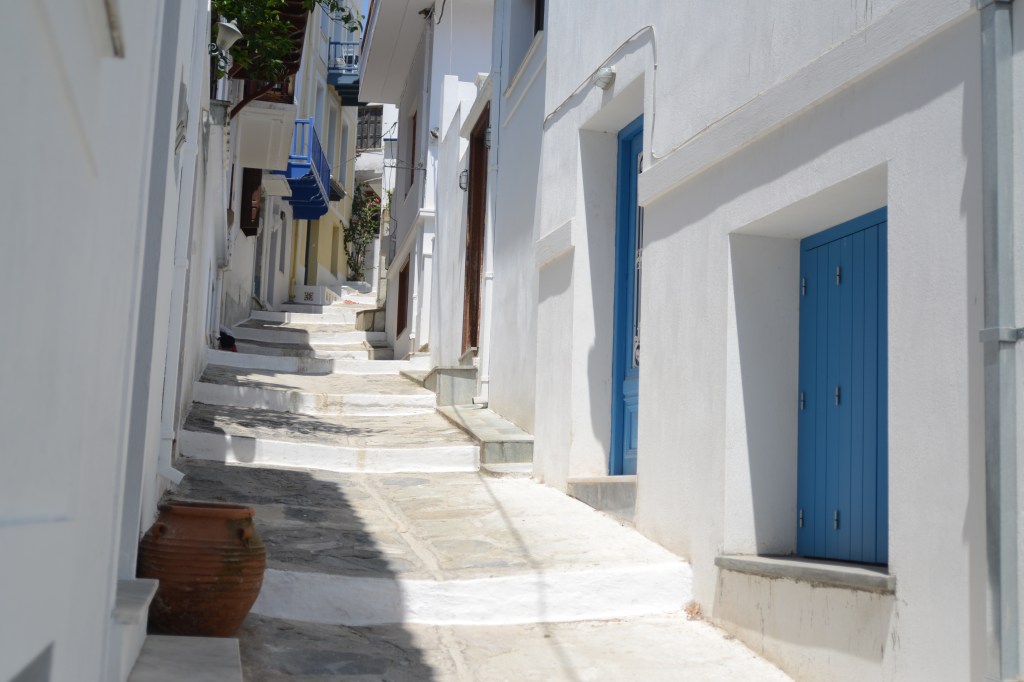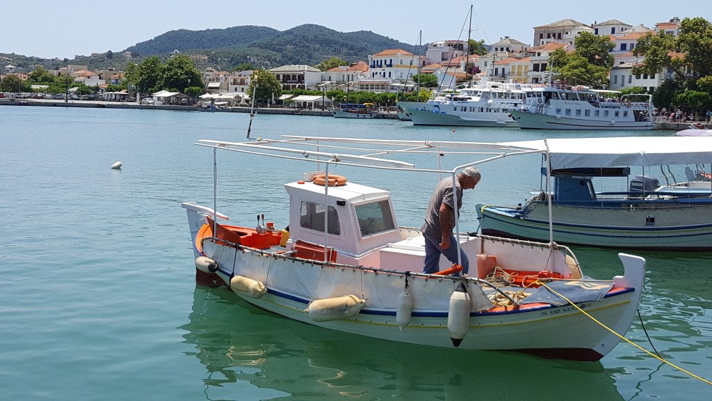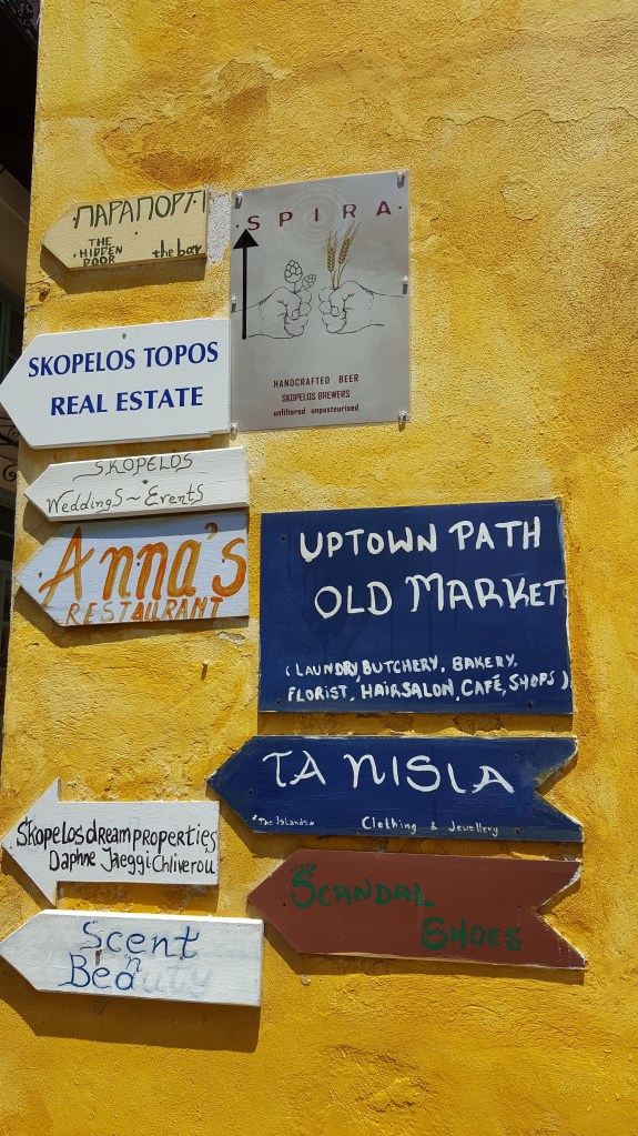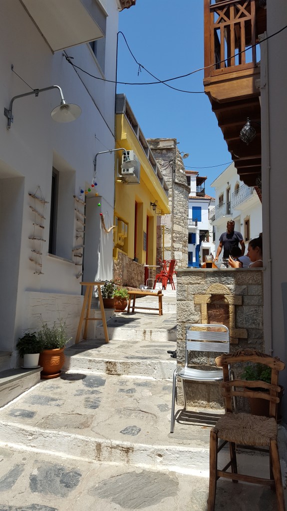 We zijn helemaal klaar om Skopelos stad te verkennen. We parkeren de auto bij de haven en gaan te voet verder. Niets is leuker dan zonder plan door de nauwe steegjes lopen en telkens verrast worden door weer een andere, prachtige gevel, een kerk, een binnenkoertje vol potten met bloemen en kruiden, een hek waardoor de zee in de verte ineens opdoemt of een leuk winkeltje of barretje. Zo komen we langs ‘Spira’ een bar waar zelfgebrouwen bier wordt verkocht. We besluiten meteen om er deze avond heen te gaan. We beklimmen de witgekalkte trappen van de Panagitsa kerk die majestueus uittorent boven de haven en genieten vanop een muurtje van het uitzicht. Ik kijk naar de dobberende vissersbootjes beneden aan de kade en naar de mensen die er langs wandelen. Ik luister naar Grieken die vanop afstand naar elkaar roepen, een man op een brommer naar een visser op z’n boot, een ober naar een andere ober. ‘Geia sou Giorgo!’ ‘Ela Yianni!’, van ver roepen ze om elkaar te begroeten. Geen schuchter handgewuif of aarzelende knik zoals dat bij ons gaat. In Griekenland gebeurt alles met ‘pathos’, of het nu gaat om eten of praten of watdanook. Het is nog iets waar ik zo van hou. Die overgave.