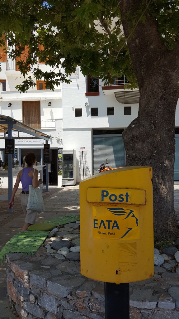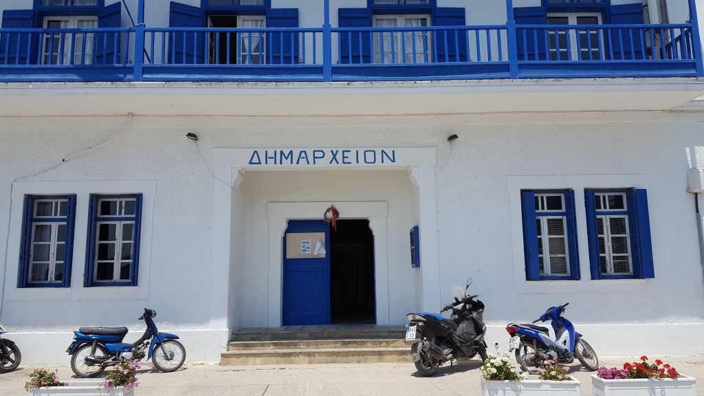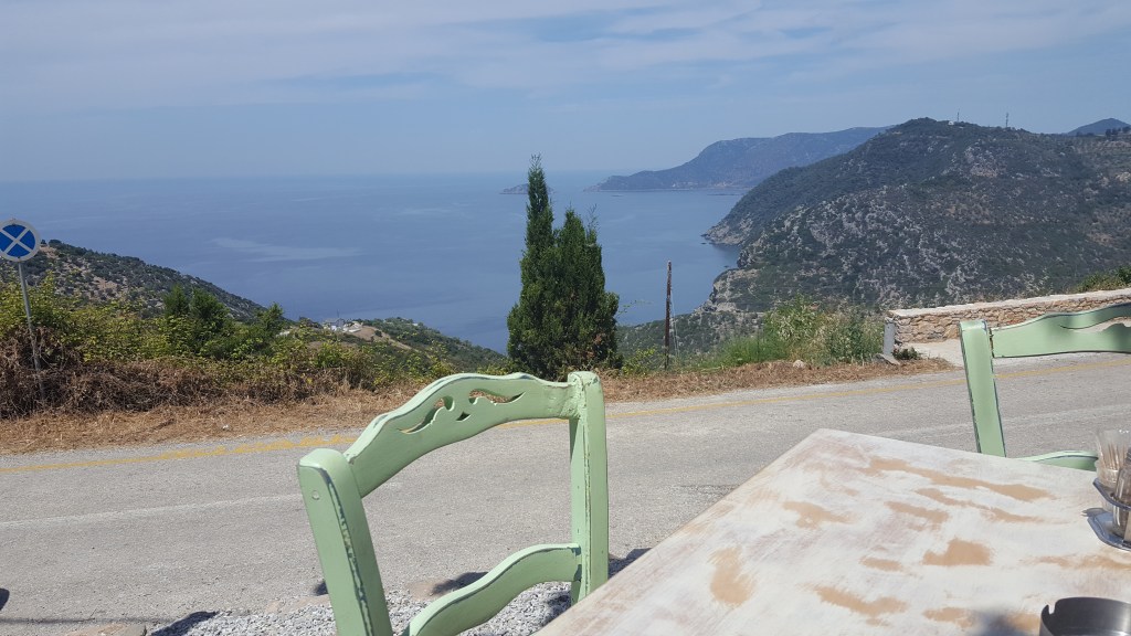 We hebben geen ontbijt gereserveerd, in plaats daarvan gaan we naar de bakker in het dorp. Het is een klein winkeltje, maar er is genoeg om uit te kiezen. Ik vind het altijd leuk om iets te proeven wat ik nog niet ken. We bestellen een paar gebakjes, twee koffies en een zakje met koulourakia om later op te eten. Er is een klein terras en we gaan even zitten in de zon. Konstantina vertelde ons deze ochtend dat ze had gehoord dat de brand onder controle was, maar dat het waarschijnlijk wel ging om kwaad opzet. Ik kan dit niet goed begrijpen, wie doet zoiets? Als je ziet hoeveel schade je aanbrengt aan je eigen, mooie groene eiland en hoeveel mensen je zo in gevaar brengt.