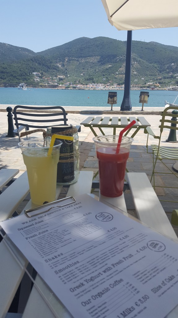 Het gaat tegen de middag, de zon weerkaatst fel op de witte stenen en het is ondertussen behoorlijk warm. Terug bij de haven beneden ontdekken we een geweldig leuk barretje dat ‘Juices and books’ heet. In de schaduw van een plataan genieten we van vers vruchtensap. Voor we vertrekken, ga ik binnen natuurlijk nog even snuisteren tussen de boekenplanken. Deze middag gaan we voor Griekse pita die we opeten op een bankje bij de plataan ertegenover. Ik heb zin om terug naar het strand te gaan bij Staphylos. Ik weet zeker dat er nog andere mooie stranden te ontdekken zijn, maar dit heeft mijn hart gestolen.