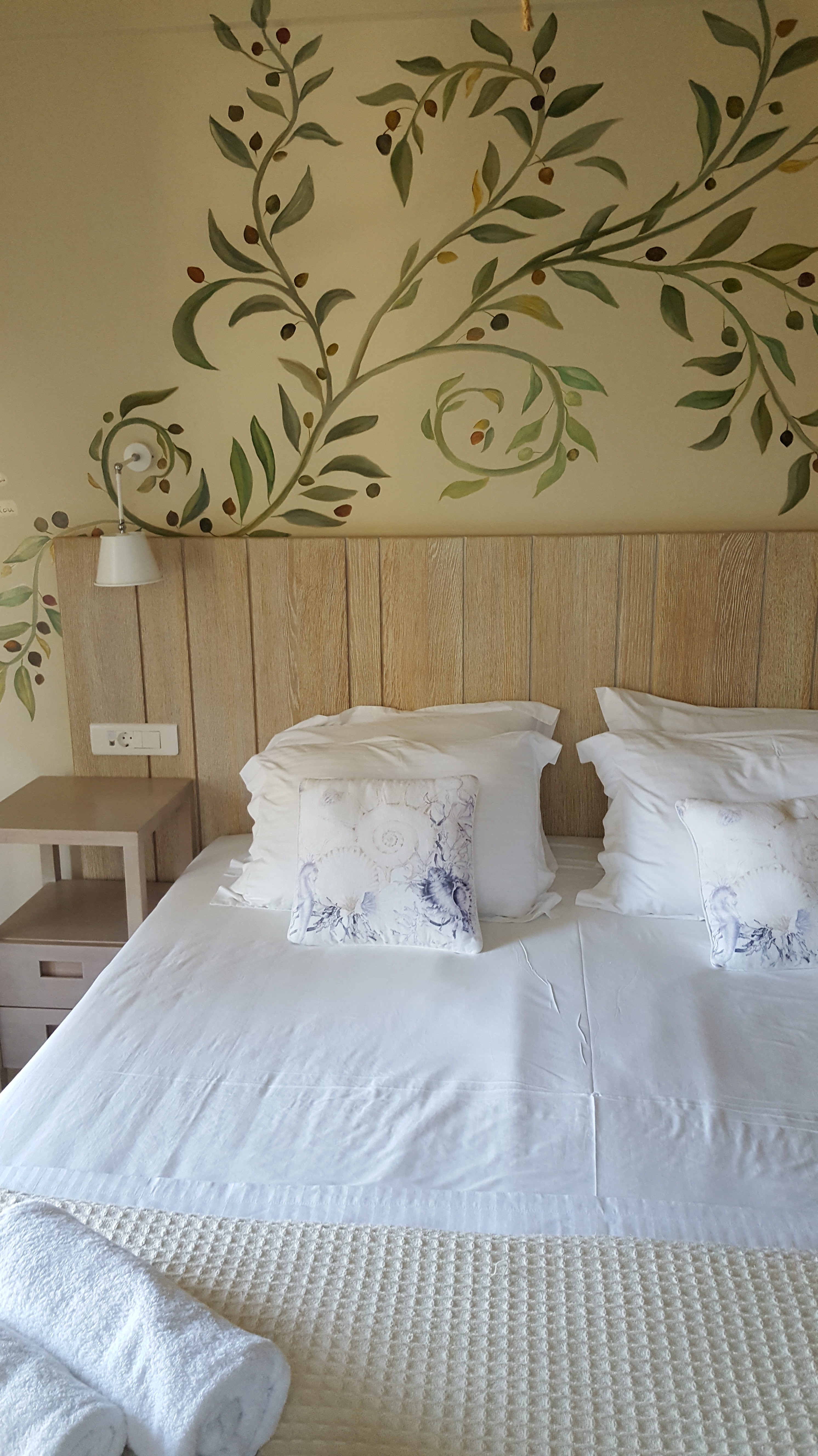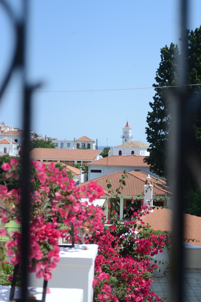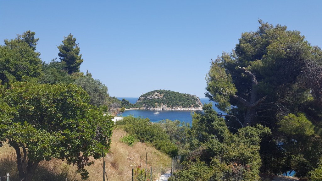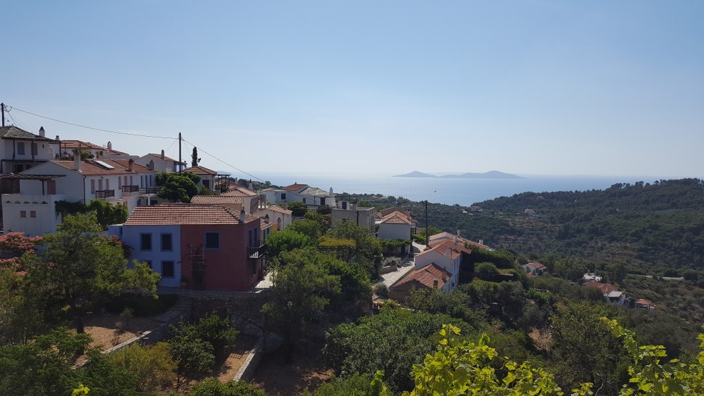 Het is wanneer we beginnen rijden dat het gebeurt, ik word een beetje verliefd. In vergelijking met het mondaine Skiathos, lijk je hier terug te gaan in de tijd. Een grote weg, waar nauwelijks een auto rijdt. Witte huisjes, vijgenbomen, oleanders, een ezel. Ik ben nog niet uitgestapt en heb nog met niemand gepraat en toch ben ik meteen gecharmeerd door de rust en de eenvoud van dit landschap. Er zit iets herkenbaars in, iets van thuiskomen. Toen hadden we nog niet eens onze gastheer en –vrouw ontmoet. Als er namelijk iets is waar Grieken goed in zijn, dan is het in je verwelkomen. Of sterker nog, je echt thuis laten voelen.