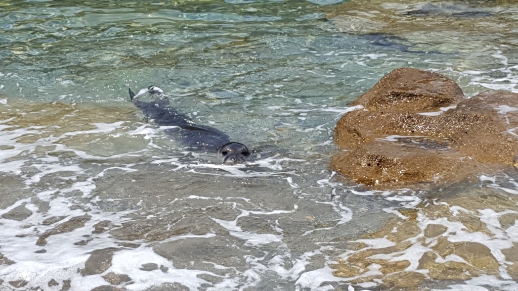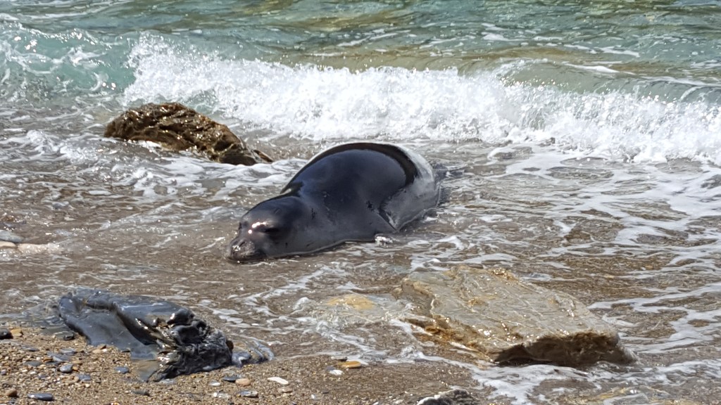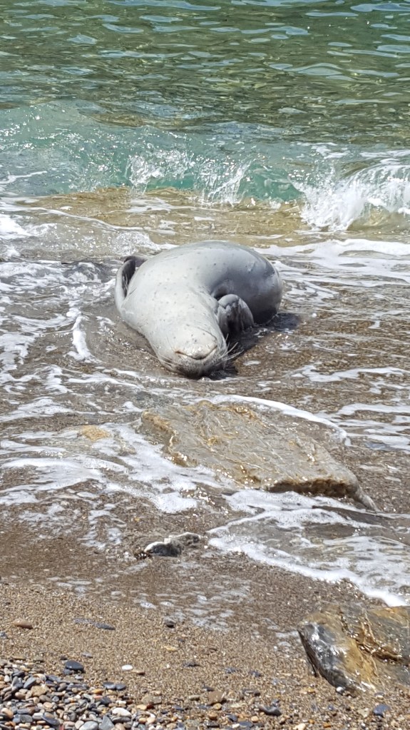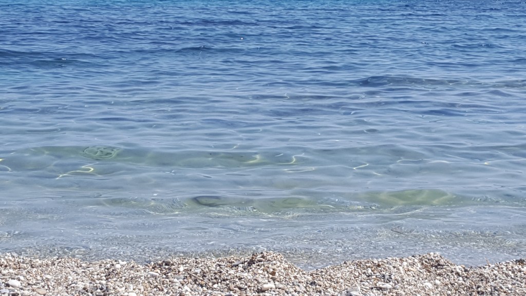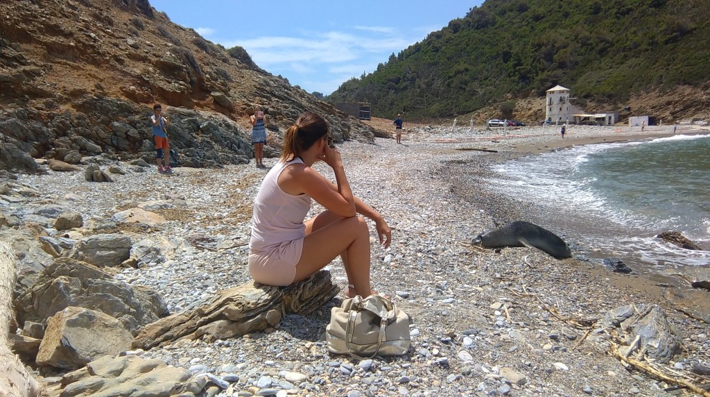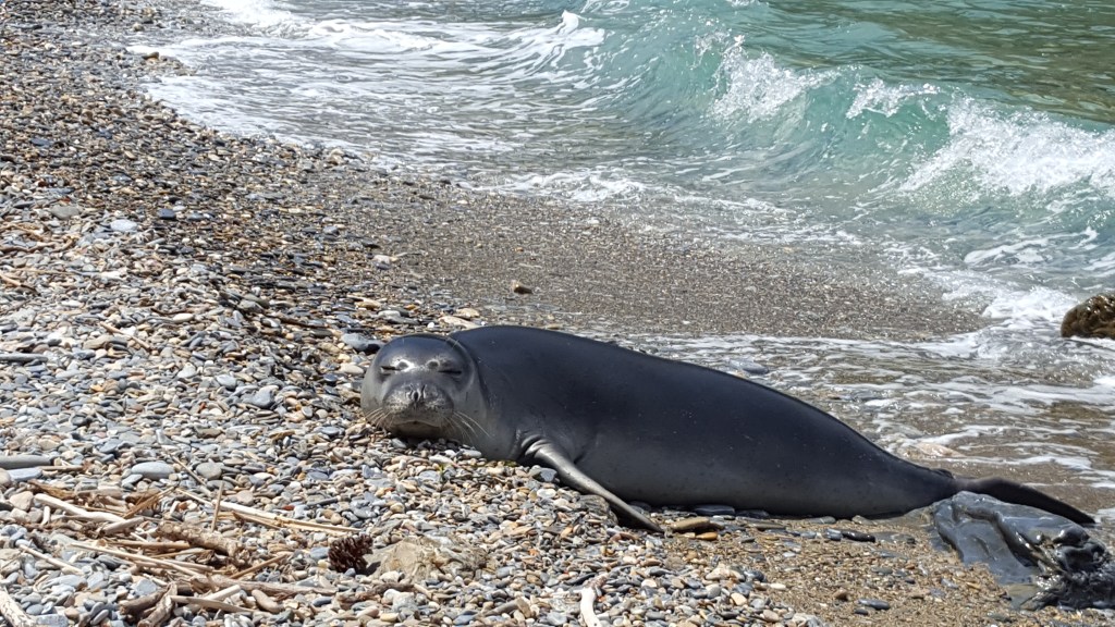 Na het ontbijt gaan we op pad. Vandaag willen we een leuk strandje vinden om te zwemmen. Onze eerste stop is Tsoukalia Beach. Niet omdat dit een geweldig strand is, maar omdat ik een pijl had gezien met ‘archeological excavation’. Nu moet je weten, als ik dergelijke pijl zie, dan ben ik niet te houden en wil ik kost wat kost tot bij de opgraving komen. Dat dat in Griekenland niet altijd even vanzelfsprekend is, zullen sommigen van jullie misschien wel weten. En dat je soms ook helemaal geen ‘archeological excavation’ vindt ook. Zoals nu dus. Ik speur heel het terrein af, maar zie nergens een overblijfsel, een zuil of een stuk steen dat er ook maar een beetje kan op wijzen. Ik zie enkel een windmolen. Hoewel deze waarschijnlijk ook al een beetje oud is, kan het niet dit zijn wat bedoeld werd. Een beetje teleurgesteld wandel ik langs het keienstrand. Tot mijn reisgenoot ineens uitroept: ‘Kijk daar, een zeehond!’ ‘Wat?’ roep ik terug, zijn woorden niet goed horend door de felle wind. ‘Een zeehond!’