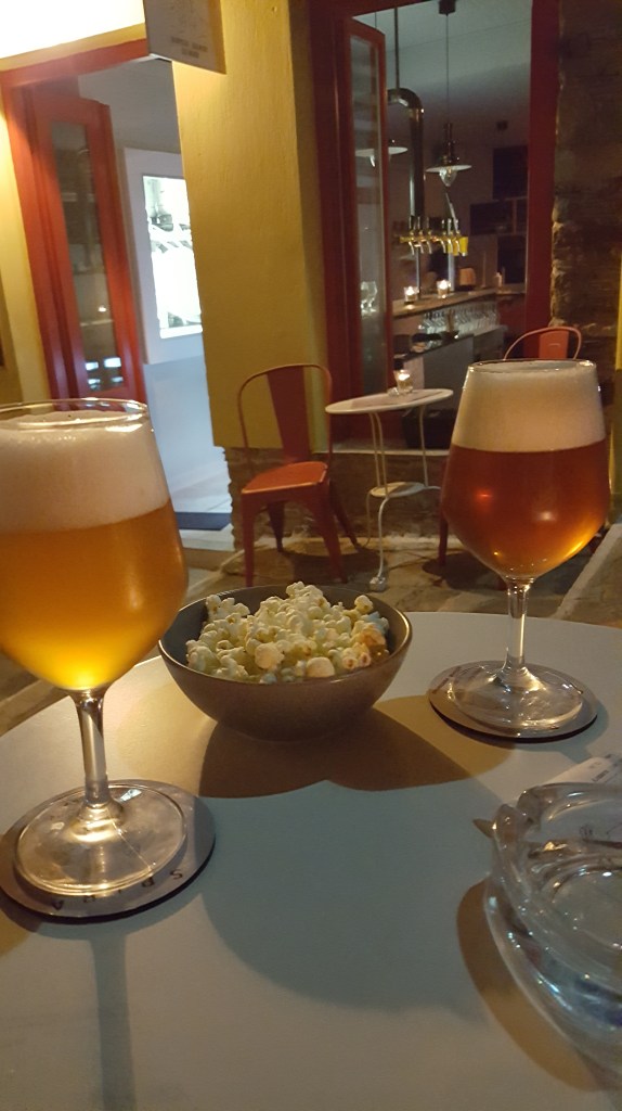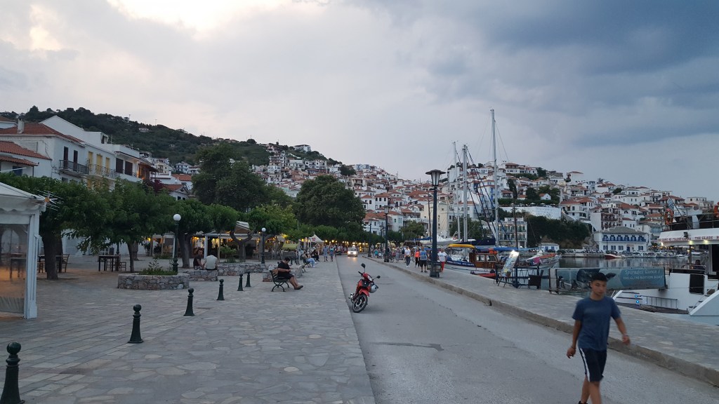 ’s Avonds rijden we terug naar Skopelos stad. Er pakken dikke, grijze wolken samen boven de haven. Ik verwacht een heuse plensbui, maar het onweer blijft uit. Griekse jongeren flaneren in groepjes langs de boulevard, toeristen proberen te kiezen tussen de vele restaurantjes, terwijl booteigenaren hen aanklampen om tickets voor hun dagcruises te verkopen. ’s Avonds komt de stad het meest tot leven. We eten verse vis in één van de vistavernes aan het eind van de kade. En zoals gezegd gaan we daarna langs bij de Skopelos brewers. Het caféterras neemt half het steegje in, er liggen kussens op lage muurtjes en er zijn kleine tafels met een paar stoelen. Niet slecht, dit zelfgebrouwen biertje. Al is het natuurlijk geen Belgisch bier. We krijgen zoute popcorn als borrelhapje en genieten van deze laatste avond op Skopelos.