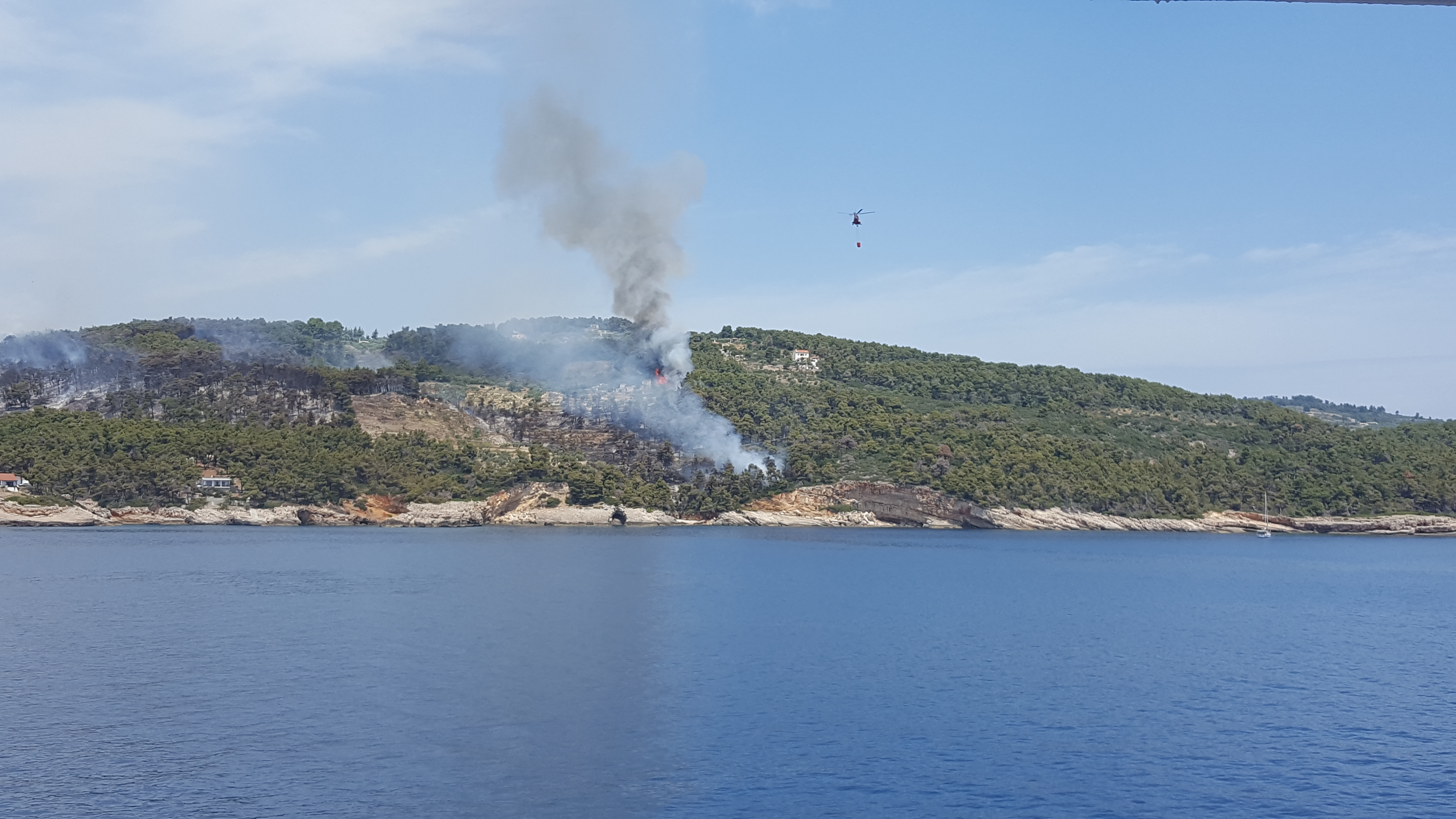 Ik schrik wakker van het geluid van een helikopter. Het duurt even voor ik weet waar ik ben. Wanneer ik rechtop kom van de houten bank waarop ik in slaap was gevallen, zie ik voor mij een paar Grieken verzameld bij de reling van de boot. De wind waait hun woorden de andere richting uit, maar aan hun manier van praten en gebaren maken, merk ik dat er wat aan de hand is. Ik sta op en ga kijken. Dikke grijze rookpluimen boven het groene eiland recht voor ons. Het brandt op Alonnisos.