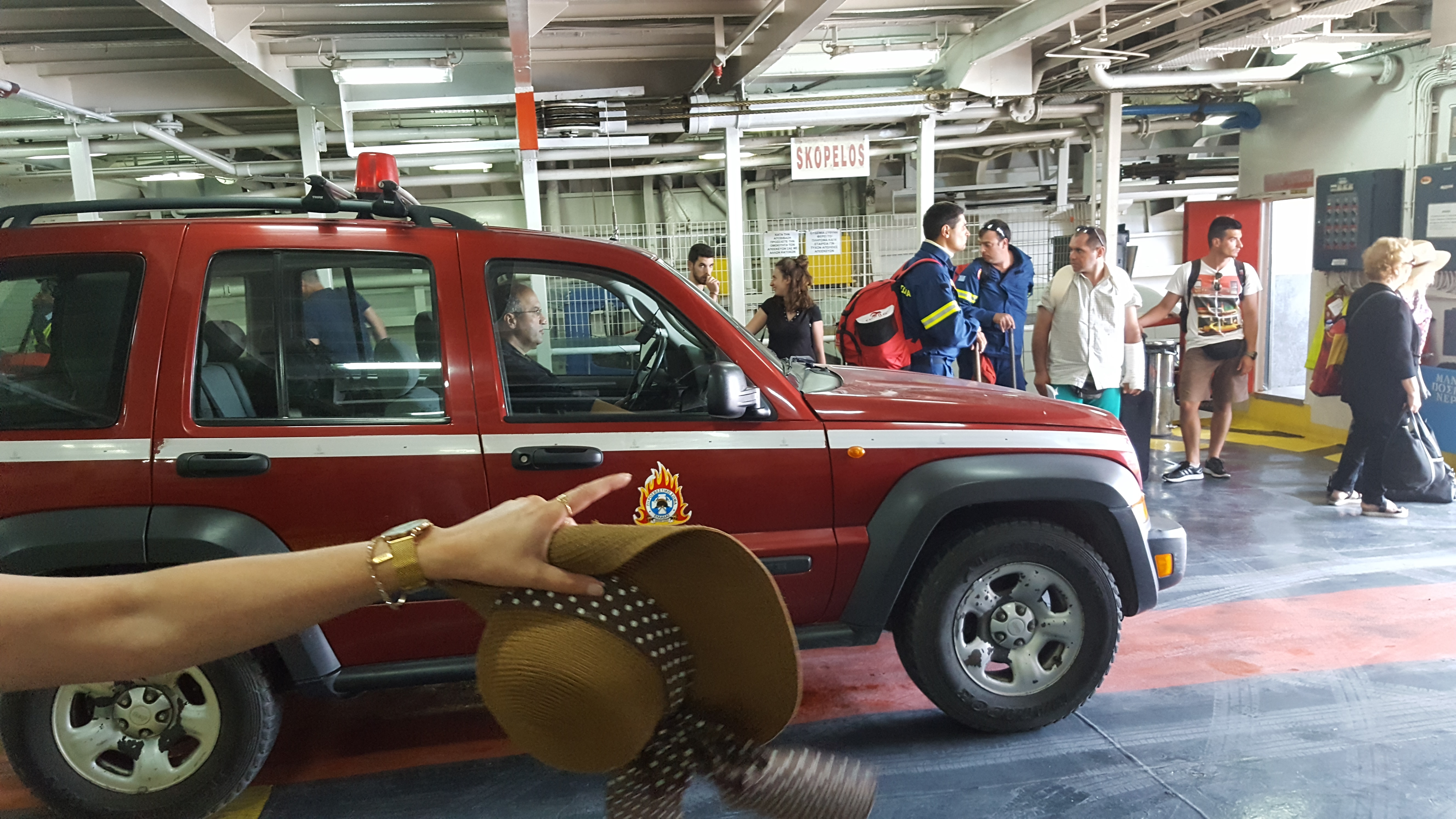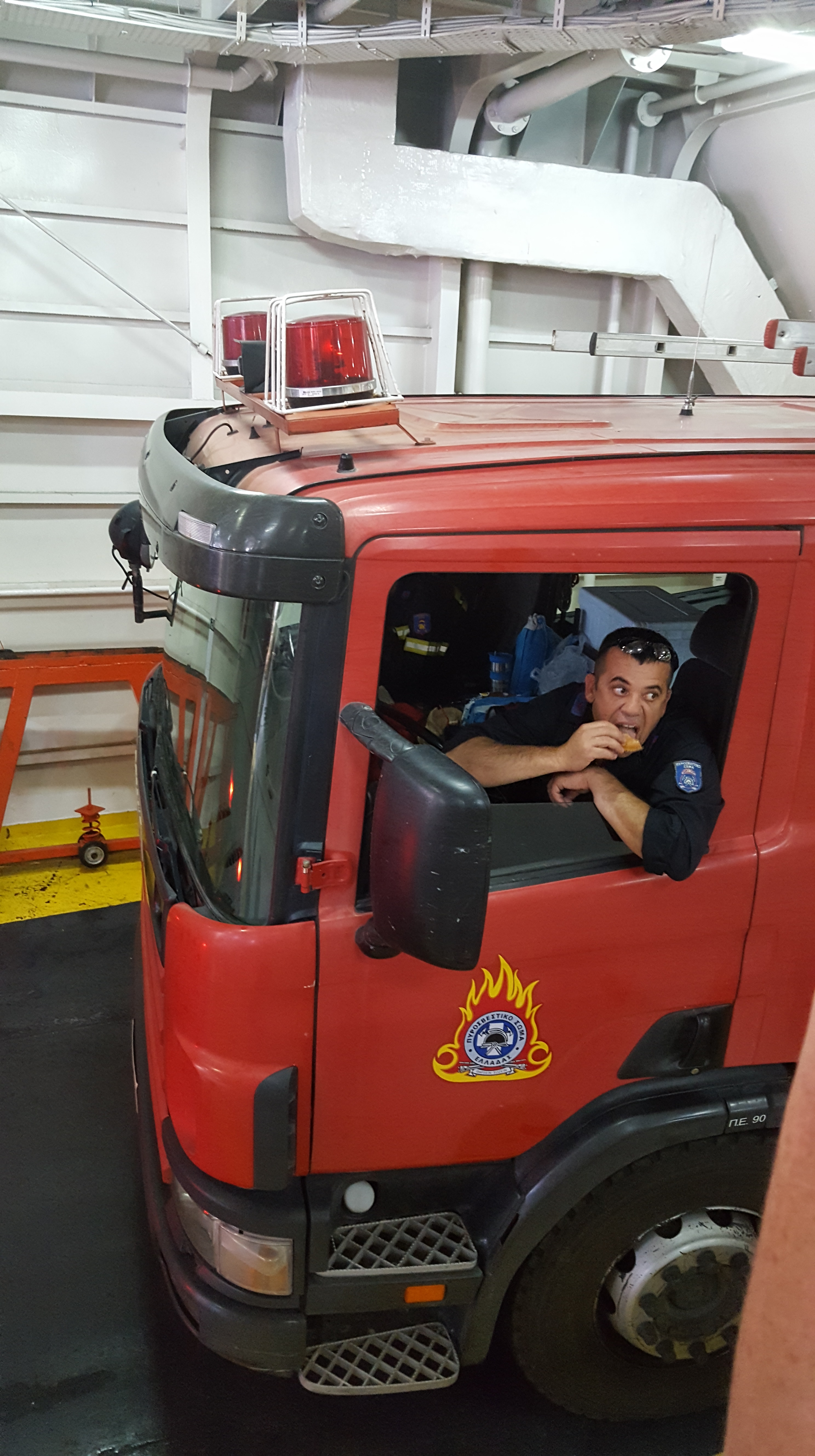 Er ontstaan kale, grijze plekken tussen het groen. Vanop afstand is het goed te zien waar de brand ravage heeft aangericht. Ik heb ineens niet zoveel zin meer om aan te komen op het eiland, ik voel me niet zo veilig. Wanneer we in de buik van de boot wachten tot we aanmeren en de laadklep opengaat, staan rode brandweerwagens als eerste in de rij om eruit te rijden. In afwachting van de actie, werkt de brandweerman in de wagen naast ons gauw nog een donut naar binnen. Je moet lef hebben om dit soort werk te doen en heel veel moed en naastenliefde.