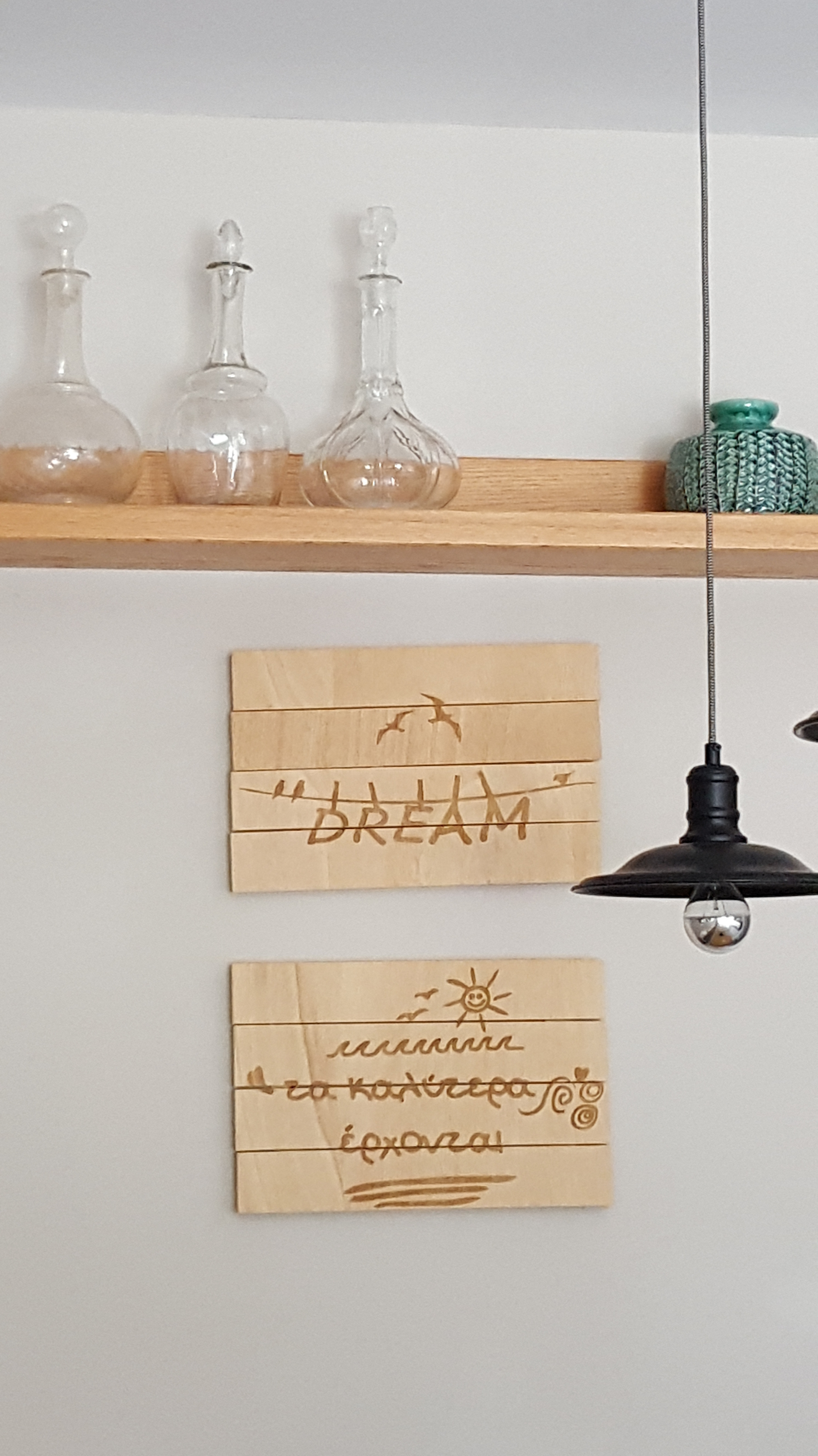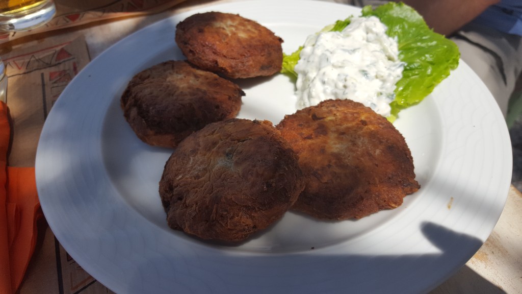 We gaan terug naar de auto om de koffers te halen. Maar het is ondertussen ver over enen en we hebben nog niet gegeten. Iets verderop ligt een pleintje in de schaduw van platanen. Er staan kleine tafels met pastelgroen geschilderde stoelen. Naast de smalle weg staat een stenen muurtje met daarnaast een afgrond naar zee. Het lijkt alsof ik in een schilderij zit, met als achtergrond de donkerblauwe zee die zich achter de rotsen eindeloos uitstrekt en aan de horizon versmelt met het felblauw van de lucht. We bestellen ‘kolokithokeftedes’, ‘courgettekoekjes’ die geserveerd worden met verse tzatziki en Grieks bier. De grauwheid van de ochtend lijkt ineens weggevaagd in dit warme Griekse middaglicht.