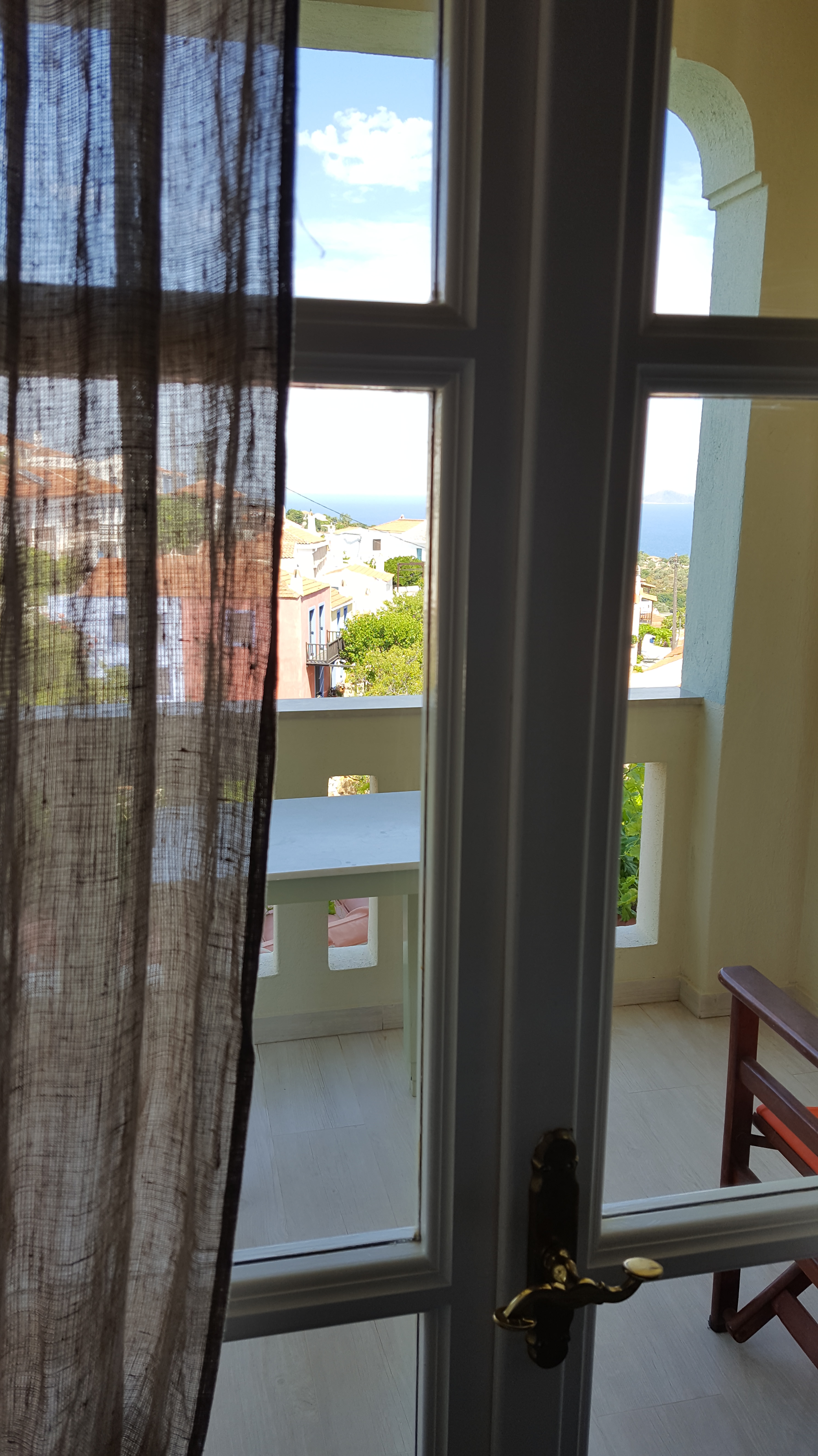 Ze neemt ons meteen mee naar de kamer zodat we ons kunnen installeren. Wat is het hier mooi, de kamer is prachtig ingericht, er is een groot zacht bed en een balkon met uitzicht, jawel, over het hele dorpje met zijn vele vijgenbomen tot aan de azuurblauwe zee. Ik hou enorm van deze vergezichten, wanneer het blauw van de zee overgaat in het blauw van de hemel en je blik eindeloos kan reizen. Dit soort wijdsheid geeft mij een gevoel van vrijheid en geluk. En wat een stilte, het is al na de middag, bijna alle luiken van de huizen zijn dicht tegen het felle zonlicht, het lijkt alsof hier niemand woont. Het enige wat je wel hoort, is het ritmische tzi-tzi, tzi-tzi, tzi-tzi van de cicaden. Konstantina wandelt terug de gang in terwijl ik haar hoor praten in het Grieks. Misschien is haar man daar. Wat vreemd zou zijn, want ze zegt op berispende toon dat hij niet in de kamer mag komen. Bij het balkon wordt het raadsel me ineens duidelijk, terug binnen loopt in haar kielzog een klein bruinwit hondje. ‘Ela Argo!’ roept ze waarna hij kwispelend mee terug de kamer uitgaat. ‘Noemt jouw hond Argo?’ roep ik uit. ‘De onze ook!’ ‘Dat meen je niet, ik krijg helemaal kippenvel!’ Ik vertel haar dat ik hem heb genoemd naar Odysseus z’n trouwe viervoeter, waarop ze mij toevertrouwt dat ook zij namen kiezen uit de Odyssee. En dat ze binnenkort grootmoeder wordt en haar kleindochter een naam zal krijgen die nog niemand in het dorp heeft. Ik glimlach naar haar. Zij naar mij. ‘Hebben jullie gehoord van de brand?’ verandert ze nu plots van onderwerp. We vertellen dat we alles gezien hebben vanop de boot. Ze vraagt naar de ravage en of we een foto hebben. ‘Ik krijg er helemaal kippenvel van’, zegt ze nu voor de tweede keer en ze wijst naar de opstaande haartjes op haar arm. Ik bedenk dat iemand die zo vaak kippenvel krijgt, een emotionele, empathische vrouw moet zijn. Dat ligt mij, mensen die emotie durven tonen. Dat is nu eenmaal iets waar Grieken goed in zijn en niet in het minst één van de vele redenen waarom ik van hen hou.