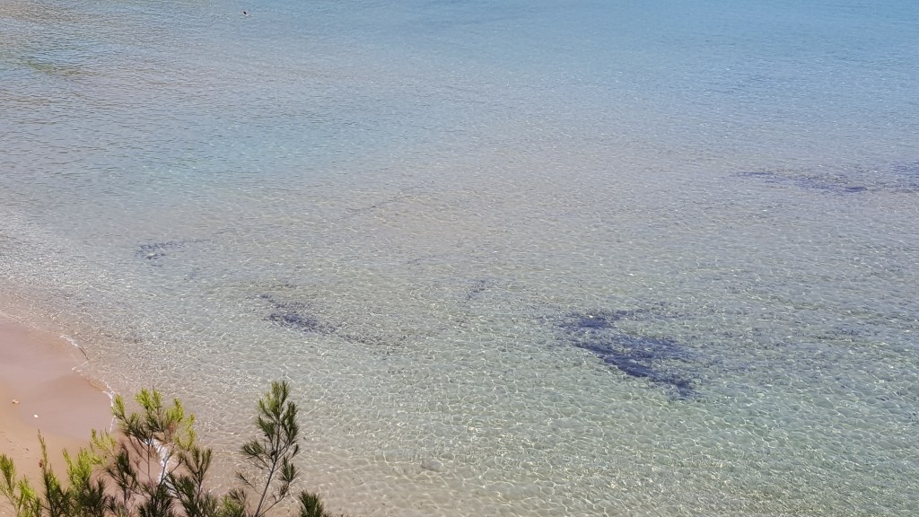 Strandzak pakken, bikini aan en teenslippers. Wat is er zaliger dan op slippers naar buiten stappen? De zachte namiddagzon op je huid voelen. De warme wind. De geur van pijnbomen. Het gezang van de cicaden en voor de rest niets dan stilte. Wanneer ik het baaitje voor mij zie opdoemen, ben ik verkocht. Het witte keienstrand wordt ingesloten door een grote rots in zee die begroeid is met pijnbomen. Het water is helder en rustig. De vorm van de baai doet mij onmiddellijk denken aan de baai in Agia Pelagia, een dorp aan de noordkust van Kreta, waar we zovele zomers doorbrachten. Ik spreid mijn handdoek uit op de kiezels en ga zitten. Er zijn ook ligzetels aan de andere kant, maar ik zit liever afgezonderd. De pijnbomen groeien hier bijna tot aan het water, hun geur vermengt zich met die van de zee. Ik luister naar het zachte geklots van de golven en hoor ook de cicaden zingen tot hier. Het brengt me tot rust. Alsof mijn gedachten beginnen meedeinen op het ritme van de zee en zo zichzelf in slaap wiegen. Het zicht is oneindig, mijn blik loopt nergens vast en kan reizen zover hij wil. Dit is vrijheid en schoonheid. We nemen een duik in het lauwwarme water en gaan dan drogen in de zon. We praten. We zwijgen. Pas als de zon achter de baai verdwijnt, keren we terug naar de kamer.