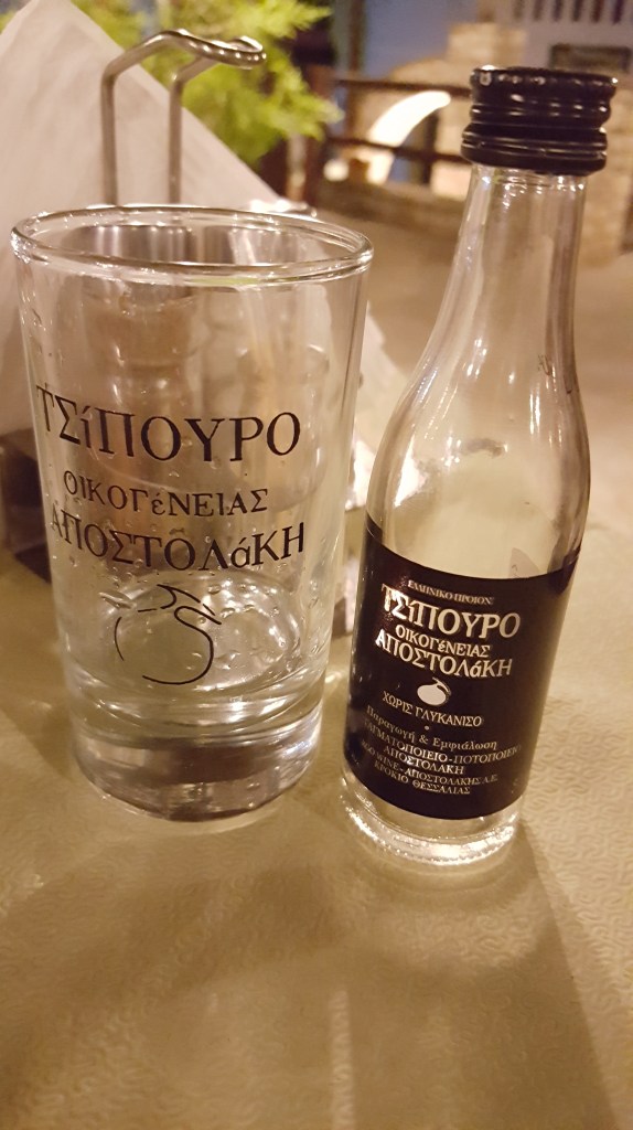 Bij terugkomst begroet Argos ons kwispelstaartend vanop het terras. Konstantina zit waarschijnlijk aan haar bureautje bij de receptie. Na een verkwikkende douche, kiezen we deze avond voor een restaurantje dichtbij in het dorp. De avond eindigt met ‘tsipouro’. Dat zegt genoeg.