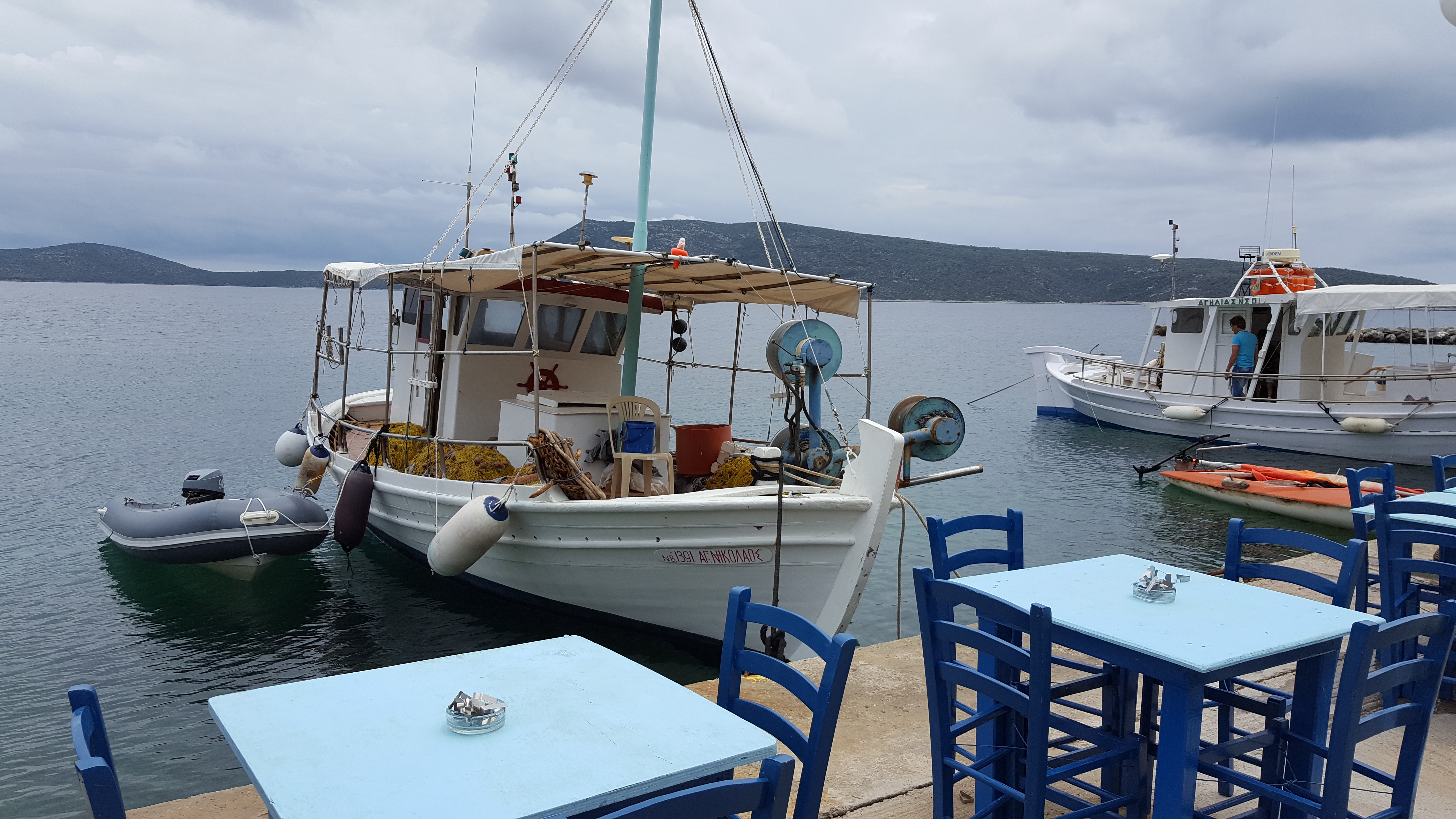 De weg eindigt in het dorpje Diafano. Er is niemand. We lopen langs de betonnen steiger waar slechts enkele kleine vissersbootjes liggen aangemeerd. Boven ons pakken donkere wolken weer samen. Het duurt niet lang of het begint te druppelen. We keren terug naar de auto. Op de terugweg houden we halt bij een groot bord langs de weg waarop een wandelroute staat aangeduid. Ook hier zijn er heel wat hiking trails. Jammer genoeg zijn we er niet op voorzien. Ik ben nieuwsgierig en wandel een klein stukje het bos in. We rijden verder en stoppen bij het dorpje Steni Vala. De regen is ondertussen opgehouden, maar de hemel ziet nog steeds loodgrijs. We lopen langs de kade waar de ene vistaverne naast de andere zich bevindt. Er is geen kat te bespeuren. De straten zijn leeg, de restaurants evenzeer. Even verderop zien we vissers hun lading verse vis naar binnen brengen. Ik vraag mij af wie die vis gaat eten. Ik vind het hier net iets te verlaten en wil liever doorgaan. Bij het volgende dorp vinden we een vistaverne waar enkele Griekse families zitten te lunchen. We kiezen een tafeltje dichtbij de zee en genieten van heerlijke vis.