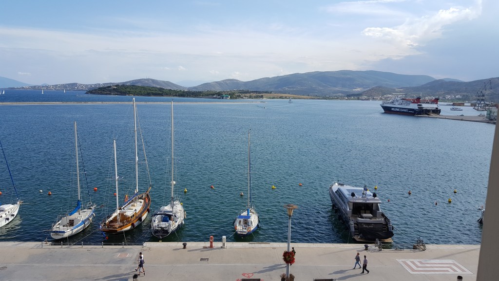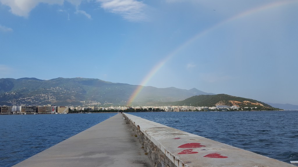 De volgende ochtend gaan we een laatste keer langs bij de bakker die ons inmiddels herkent. We nemen een zak met kleine koekjes mee voor op de boot. We namen afscheid van onze vriendelijke gastvrouw Konstantina en haar hondje Argos en het naar vijgen geurende dorp. Na een boottocht van een paar uur die ik voornamelijk wegslaap op de harde, oranje plastic stoelen, staan we terug op het vasteland. In Volos is de zon door de wolken gebroken. Tijdens onze wandeling langs de pier, verschijnt een grote regenboog aan de hemel. De terrassen zitten afgeladen vol. Grieken drinken koude koffie, spelen tavli, praten luid of telefoneren nog luider. Het is weer wennen aan de drukte van de stad. Ik ben al ongeduldig naar devolgende bestemming.